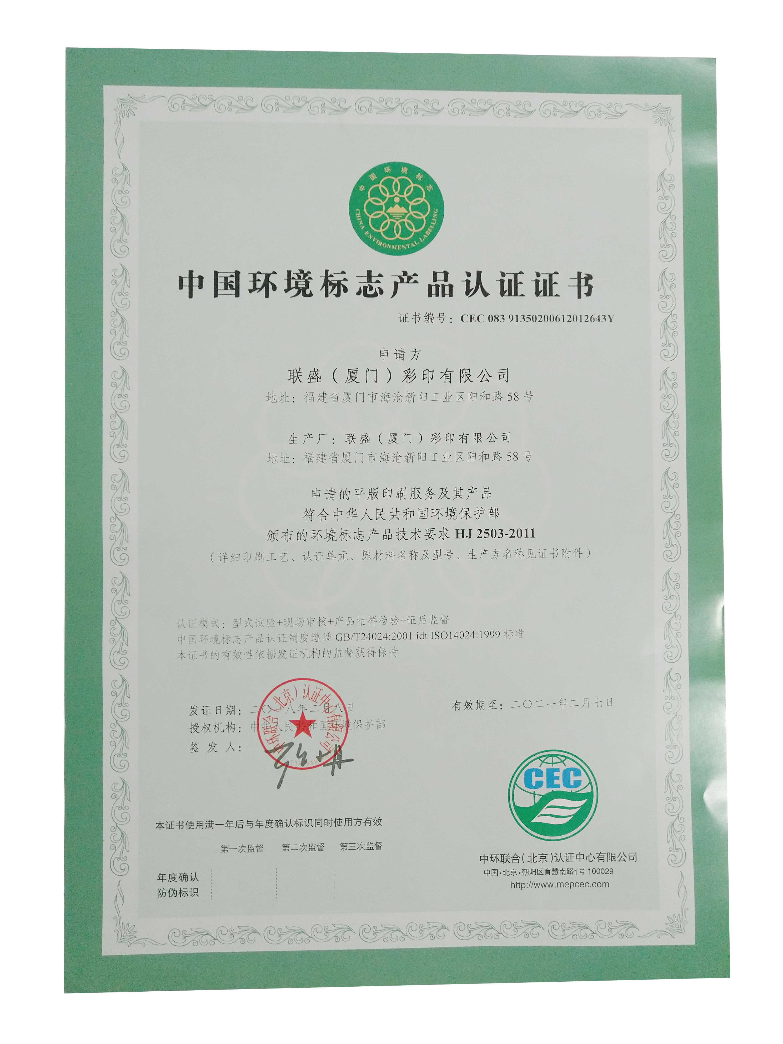 | 联盛彩印顺利通过中国环境标志产品认证 2018-03-14 | 近日,联盛彩印顺利通过了中国环境标志产品认证,取得这一认证标志着联盛获得进入国际市场的“绿色通行证”,开启了绿色包装的新纪元...[更多详细信息] | |